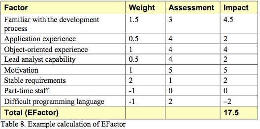 An example assessment of a project's environmental factors is shown in Table 8. The weighted assessments for these eight individual factors are summed into what is called the EFactor. The EFactor is then used to calculate the Environment Factor, EF, as follows:
